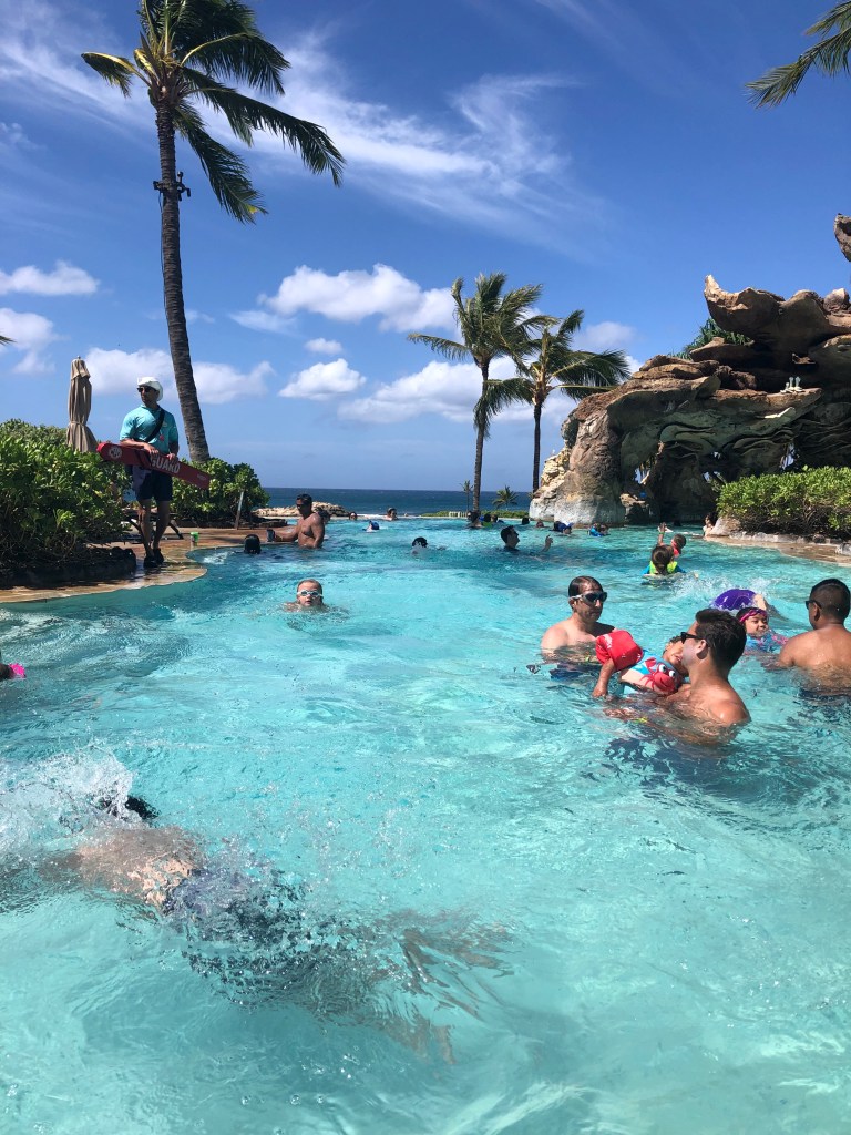 It’s really more of a waterpark. Filled with lifeguards, beach chairs, life jackets, shade, sun, and people, there is literally something for everyone. Immediately upon entering, your pulse slows as your are greeted with the lazy river. As you wind your way through the palm and plumeria-studded paths, you uncover something new at every turn. I think it took us 3 days before we had fully discovered each of the different water options. Here are some of our favorites: